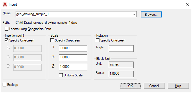 Explodes the block and inserts the individual parts of the block. When Explode is selected, you can specify a uniform scale factor only.