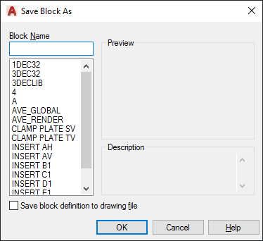 Saves the block definition as a drawing file. Selecting a pre-existing drawing file overwrites the saved file. By default, the block name specified is taken as the drawing file name.
