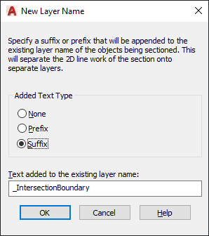 By default, all section block geometry is placed on Layer 0 (zero). However, you can specify suffix or prefix labels to help organize section block components, such as intersection boundaries and fill. When the section block is inserted, the section block components are placed on new layers whose name combines the name of the layer that contains the sectioned object and the prefix or suffix you specify. If the section plane includes objects on two or more layers, two or more new object layers are created.