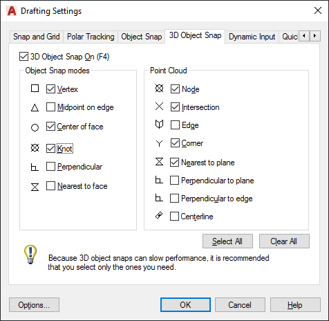 Controls running object snap settings for 3D objects and point cloud features.