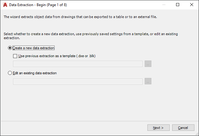 Creates a new data extraction and saves it to a DXE file. You can also specify a previous extraction file (DXE or BLK) to use as a template file.