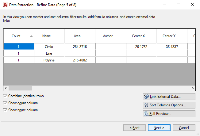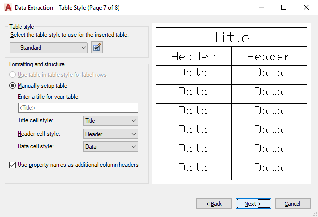 Controls the appearance of the data extraction table. This page is displayed only if AutoCAD Table is selected on the Choose Output page.
