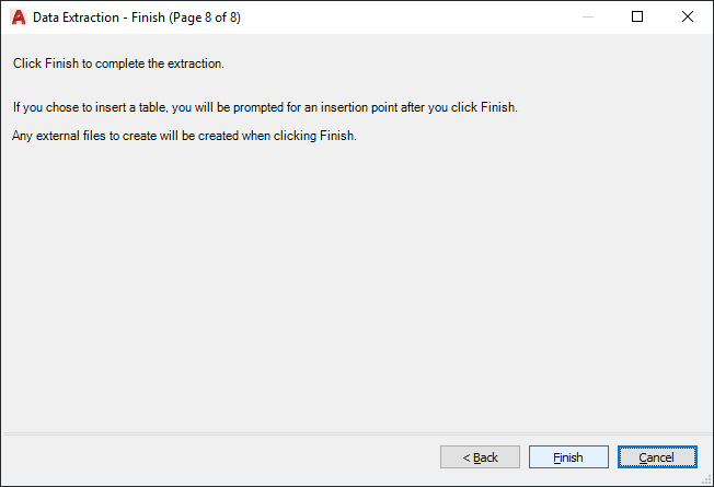 Creates a table that is populated with extracted data. You are prompted to insert the table into the current drawing when you click Finish on the Finish page.