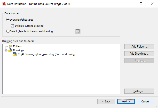 Specifies the drawing files, including folders from which to extract data. Allows selection of objects in the current drawing from which to extract information.