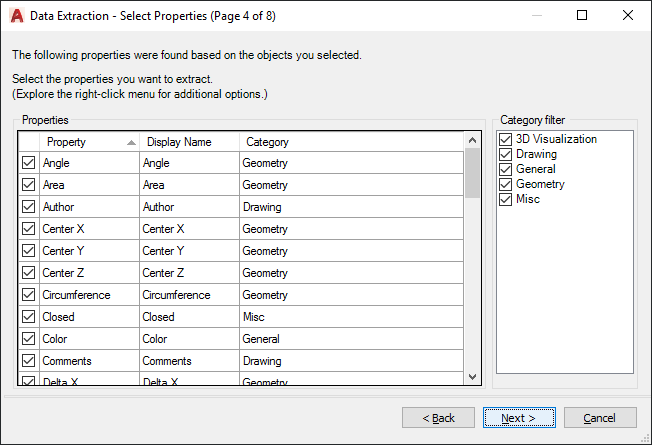 Displays a list of categories that are extracted from the property list. Unchecked categories filter the Properties list. Categories include 3D Visualization, Attribute, Drawing, Dynamic Block, General, Geometry, Misc, Pattern, Table, and Text.