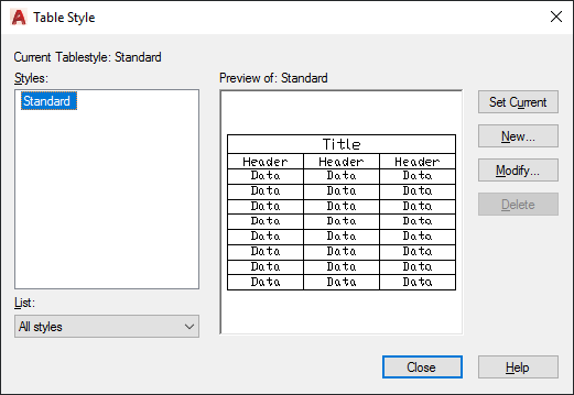 Deletes the table style selected in the Styles list. A style that is being used in the drawing cannot be deleted.