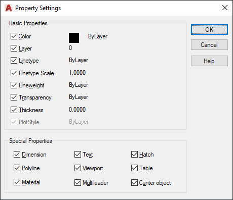 In addition to basic object properties, changes the hatch properties (including its annotative properties) of the destination object to that of the source object. To match the hatch origin, use Inherit Properties in HATCH or HATCHEDIT. Available only for hatch objects.