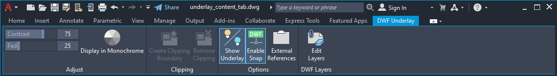 When you select a DWF underlay in a drawing, the DWF Underlay Contextual tab is displayed on the ribbon.
