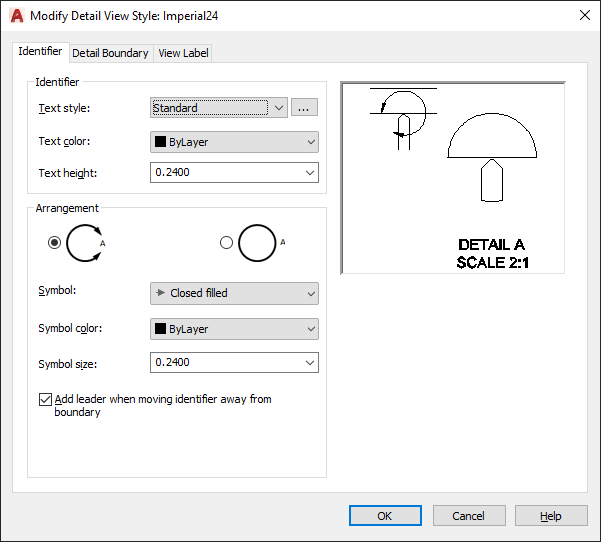 When selected, connects the detail boundary to the identifier with a leader, when the identifier is moved away from its default placement.