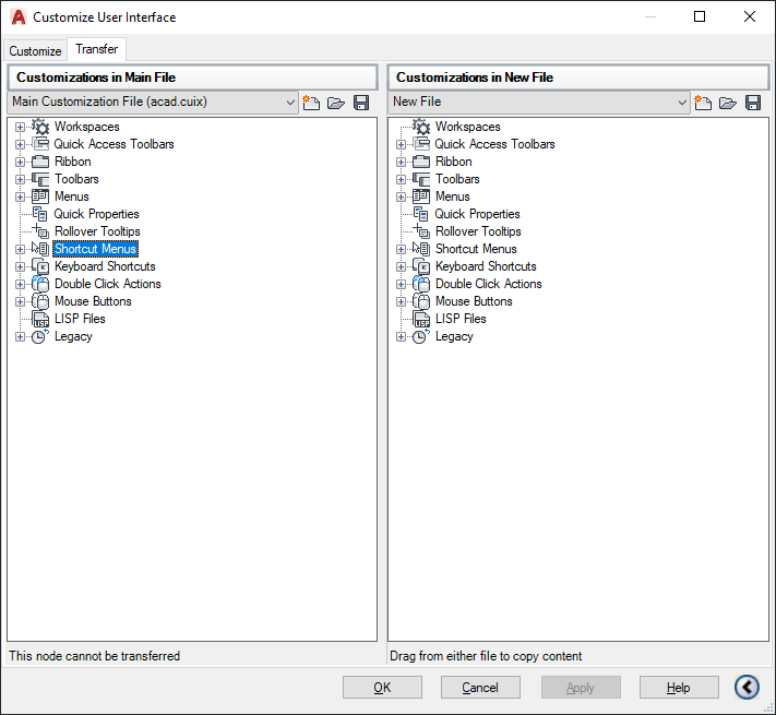 When you enter CUIIMPORT at the Command prompt, the main CUIx file is displayed in the right pane (acad.cuix for AutoCAD files or acadlt.cuix for AutoCAD LT files by default). You open a CUIx or legacy customization file in the left pane to transfer data. When you enter CUIEXPORT at the Command prompt, the main CUIx file is displayed in the left pane. You open another CUIx or legacy customization file in the right pane to transfer data.