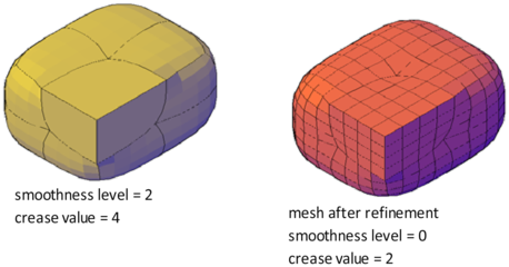 A crease that is set to Always retains its sharpness no matter how much you smooth or refine the object. However, the behavior is different when you assign a crease value. If you refine an object or edge that has a crease value, the assigned crease value is lowered by the value of the original level of smoothing. Suppose that you add a crease with a crease value of 4 and then refine a mesh whose level of smoothness is 2. The new crease value is 2.