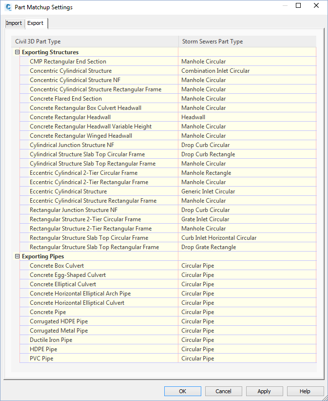 There are Default Parts Matching limitations when importing and exporting data from Storm Drain to Autodesk Civil 3D and then back to Storm Drains.