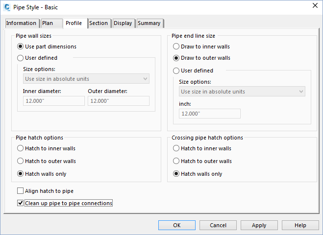 Use the Clean Up Pipe To Pipe Connections option in the Pipe Style dialog box, as shown in figure 4, to improve the appearance of pipe profiles so that the pipes graphically appear to line up as expected. This option is not enabled by the default, so you must select it.