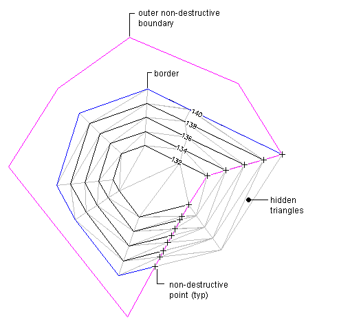 Boundaries are closed polylines that affect the visibility of the triangles either inside or outside the polylines. An outer boundary defines the extents of the surface. All triangles inside the boundary are visible, and all triangles that are outside the boundary are invisible.