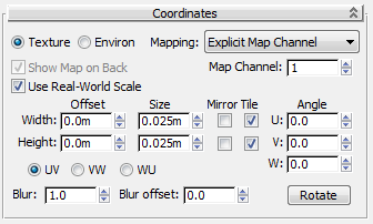 - Changes the mapping coordinate system (the direction in which the map is projected) from UV to VW or UW. UV projects onto the surface of geometry like a slide projector. VW and WU project the map at right angles to the geometry. With a Combustion map, UV is almost always the most useful choice.