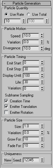 Items on this rollout control when and how quickly particles form, how particles move, and the size of the particles over time.