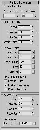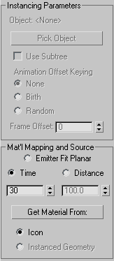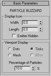 This section describes the Display Icon group in the Basic Parameters rollout, the Particle Motion group in the Particle Generation rollout, and the Material Mapping and Source group in the Particle Type rollout. These are the only controls unique to Blizzard. The other Blizzard rollouts and their contents are identical with those in Particle Array, except that Object Fragments and associated settings are not available on the Particle Type rollout. See PArray for details or choose from the following list for rollout information.