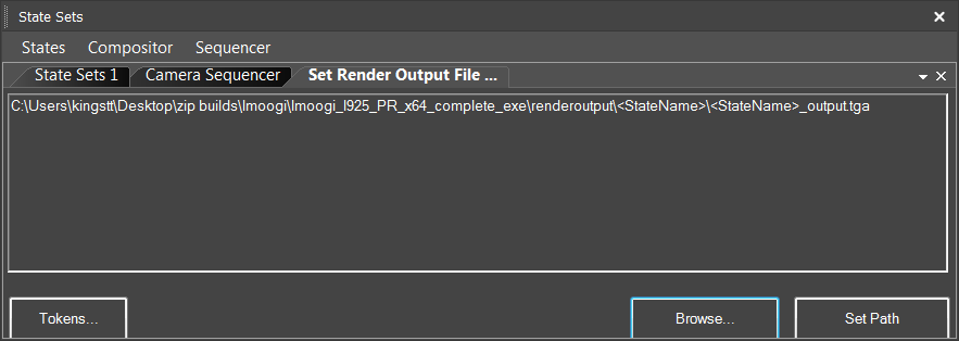 RenderOutput path. To this it appends a folder with the name of the state by means of the {stateName} token and the file name {stateName}_output.tga. So, for example, if the state name is BrightLight, its output will be a file named