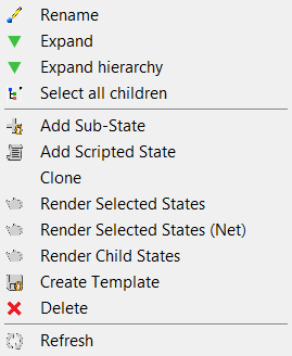 - Produces rendered output for child states of the state you right-click. See Render All States on the main States menu. Available only when right-clicking a state item in the list.