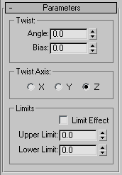 Applies the twist effect only to vertices that lie between the lower and upper limits. The two spinners represent distance along the gizmo's Z axis (Z=0 is at the gizmo's center). When they are equal, it is the same as disabling the twist effect.