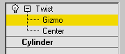 You can translate and animate the center at this sub-object level, altering the Twist gizmo's shape, and thus the shape of the twisted object.