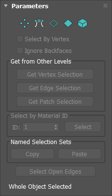 The icons at the top of the Selection rollout let you specify the method of face selection. Clicking a button here is the same as selecting a sub-object type in the modifier stack. Click the button again to turn it off and return to the object selection level.