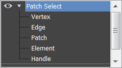 The Patch Select modifier lets you pass a sub-object selection up the stack to subsequent modifiers. It provides a superset of the selection functions available in the Edit Patch modifier. You can select vertices, edges, patches, and elements. You can also change the selection from sub-object level to object level.