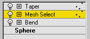 When you make a sub-object selection, the stack display changes to show you are no longer working with the whole object. Consider the effect of a Mesh Select applied between Bend and Taper modifiers (Bend is below Taper). To the right of the Mesh Select and Taper modifiers, a sub-object icon (similar to the sub-object button in the Selection rollout) appears to show that sub-object selection is now in effect.