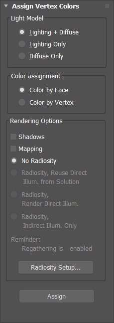 This rollout gives you access to the same controls found in the Assign Vertex Colors utility. They let you take the scene lighting information and bake it into the vertex channel system.