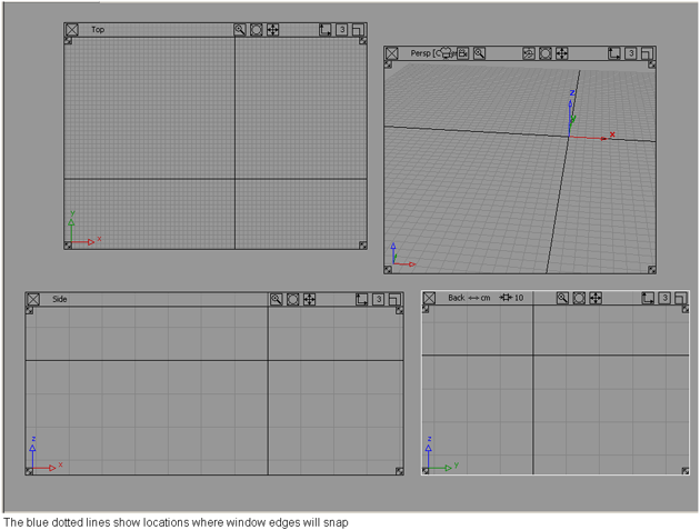When resizing or moving a window, a magnetic region along all the other windows edges helps you to align the window and snap it into place. The edges around the perimeter of the Alias work space can also be used as snapping points (see the following picture).