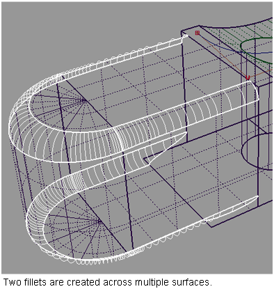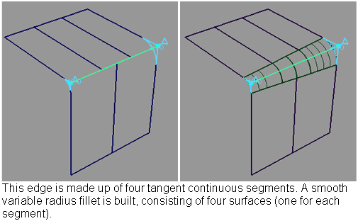If two or more edges are tangent continuous, they are treated as a single edge. Creating a smooth variable radius fillet across the surfaces then requires only two radius manipulators (rather than one for each edge). However, the fillet will be made up of a separate surface for each edge.