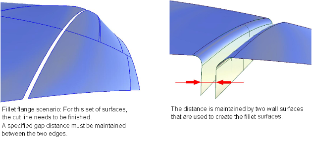 These two examples identify the two main cases for finishing surface edges. For the first case, there is a pre-defined contact line where the edge finish (consisting of a fillet and flange) needs to be added.