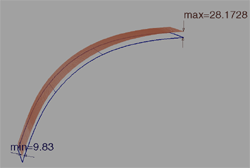 Remember that for “curves” you can use surface edges, trim edges, isoparametric curves, and curves-on-surface in addition to free curves. For all tools, you can also select objects in reference layers. The tool displays a deviation comb indicating the deviation across the length of the objects, labeling the minimum, maximum, and mean. The Mesh to Surface deviation tool only displays the minimum and maximum deviations.
