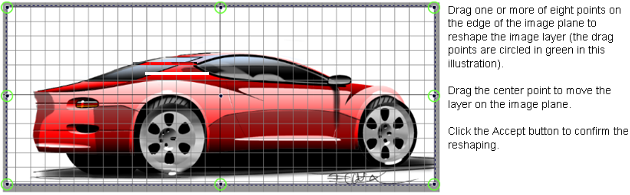 All Alias snap modes (grid, point, and curve) work with image deformation, allowing the manipulator handles to be snapped to geometry.