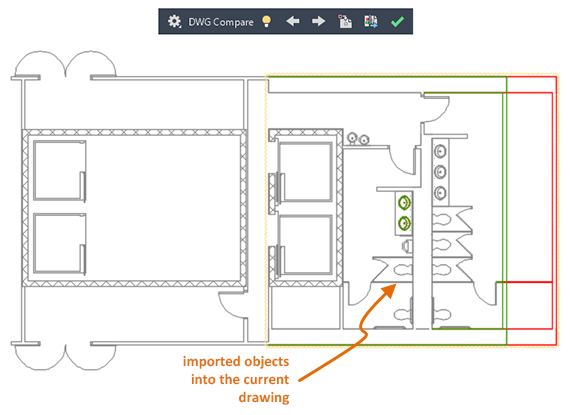 You can import the highlighted differences (red) from the compared drawing into the current drawing. If you do so, these objects will now exist in both drawings and will automatically turn gray. Only the objects that are not in the current drawing can be imported.