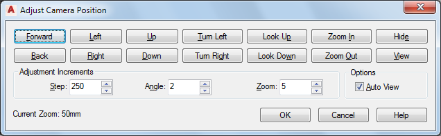 As you click each button, the view changes in increments determined by values in the Adjustment Increments section. If Auto View is selected, you can see the change after you click each button. If Auto View is cleared, click View to see the changes.