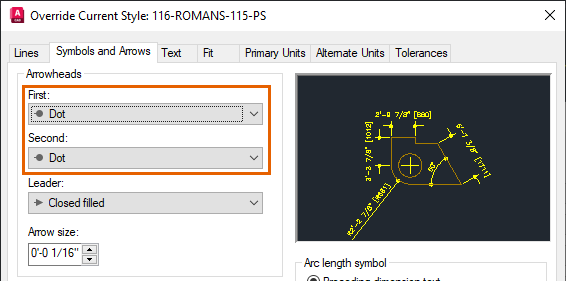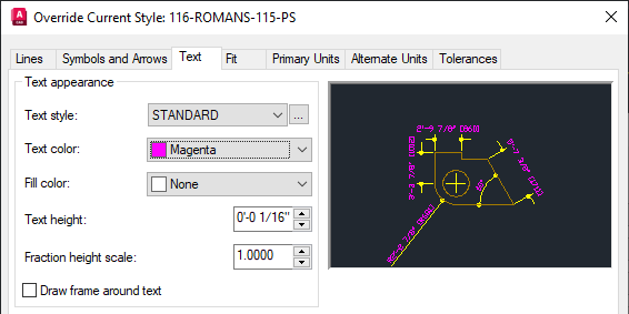 The settings that were overrides are now the default settings for the 116-ROMANS-115-PS dimension style.