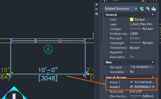 Change any of the properties for the dimension. For example, change the arrow style to Architectural Tick.