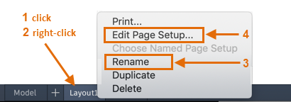 The first thing that you should do when you access a layout tab (1) is right-click the tab (2) and rename it (3) to something more specific than Layout 1. Names that reference a specific ANSI or ISO size might be a good choice.