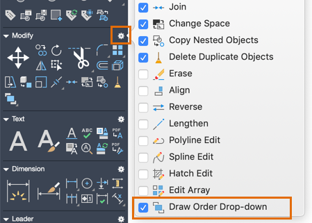 Expand the drop-down to see draw order options including sending all hatches to the back, selected objects to the front, and so on.