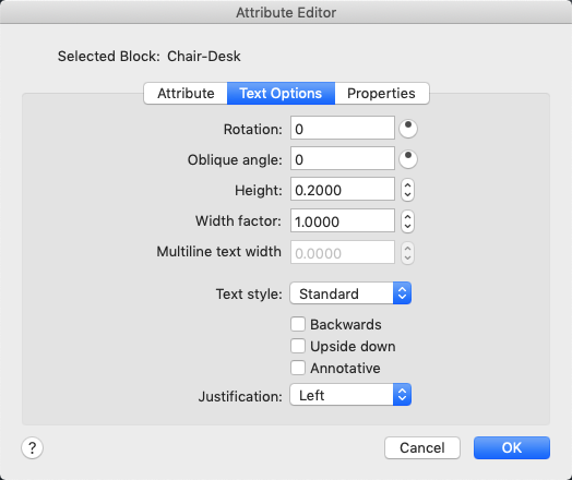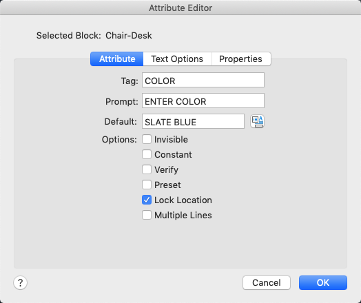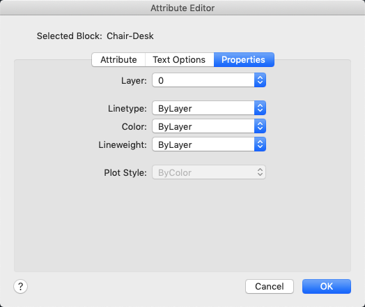 Defines the layer that the attribute is on and the color, lineweight, and linetype for the attribute's line. If the drawing uses plot styles, you can assign a plot style to the attribute using the Properties tab.