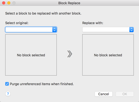 Select the block to be replaced from the Select Original drop-down menu. Then select the block to be replaced from the Replace With drop-down menu and click OK.