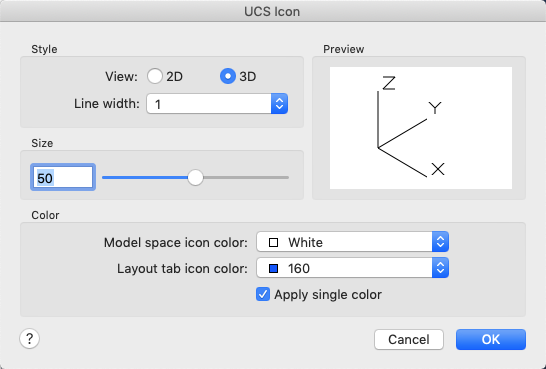 Applies the selected Model space icon color to all axes of the 2D UCS icon.