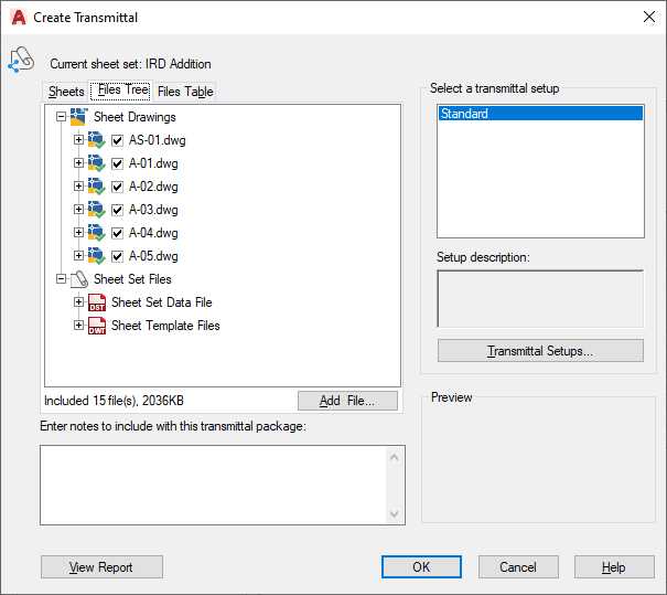 By default, all files associated with the current drawing (such as related xrefs, plot styles, and fonts) are listed. You can add files to the transmittal package or remove existing files. Related files that are referenced by URLs are not included in the transmittal package.