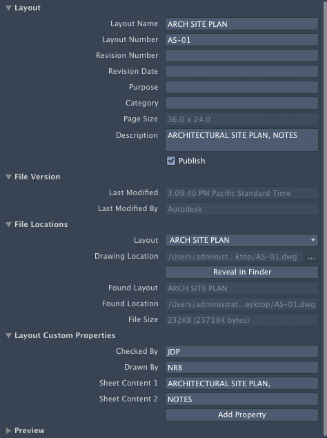 Displays information that is specific to the selected layout, such as the name, number, and whether it will be included in publishing operations. Also displays custom properties, if any.