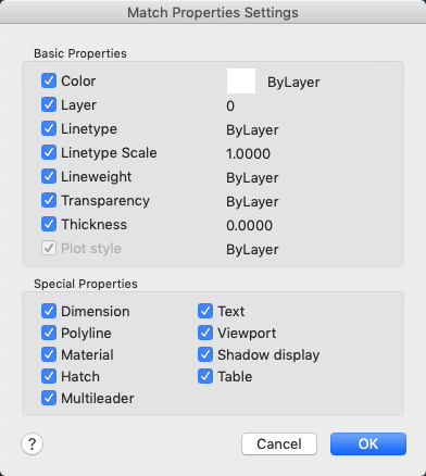 In addition to basic object properties, changes the hatch properties (including its annotative properties) of the destination object to that of the source object. To match the hatch origin, use Inherit Properties in HATCH or HATCHEDIT. Available only for hatch objects.