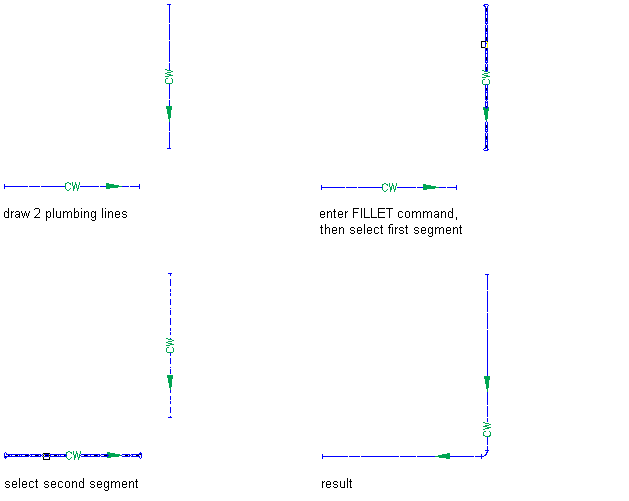 In AutoCAD MEP 2022 toolset , you can use FILLET to fillet not only AutoCAD objects, such as lines, polylines, and arcs, but also schematic lines and plumbing lines. By using FILLET with a fillet radius of zero (default), you can easily connect schematic lines or plumbing lines by extending or trimming them. You can use the command in orthographic mode or isometric mode.