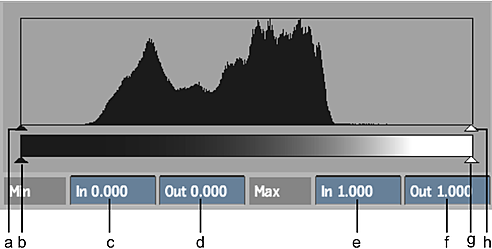(a) Minimum Input slider (b) Minimum Output slider (c) Minimum Input field box (d) Minimum Output field (e) Maximum Input field (f) Maximum Output field (g) Maximum Output slider (h) Maximum Input slider