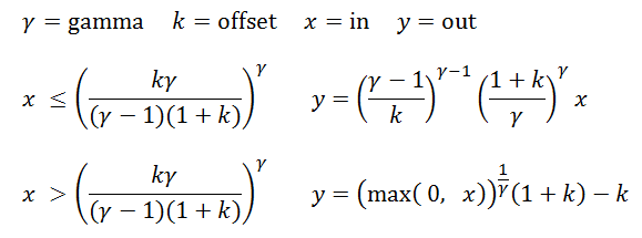 | "moncurveFwd" | Applies a function that has a linear segment near the origin (black) and a power-law segment at higher values. At the junction, the curve is continuous in both value and tangent. This type of curve is used in the Rec. 709, sRGB, and CIE L* equations.