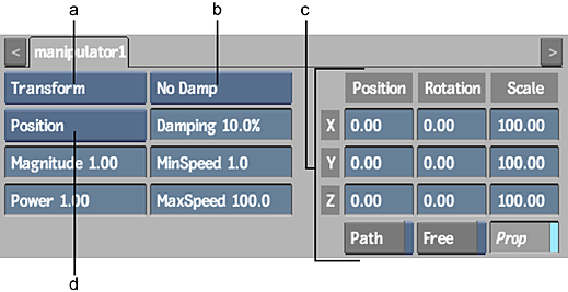 (a) Manipulator Type box (b) Damping box (c) Axis controls (d) Influence box